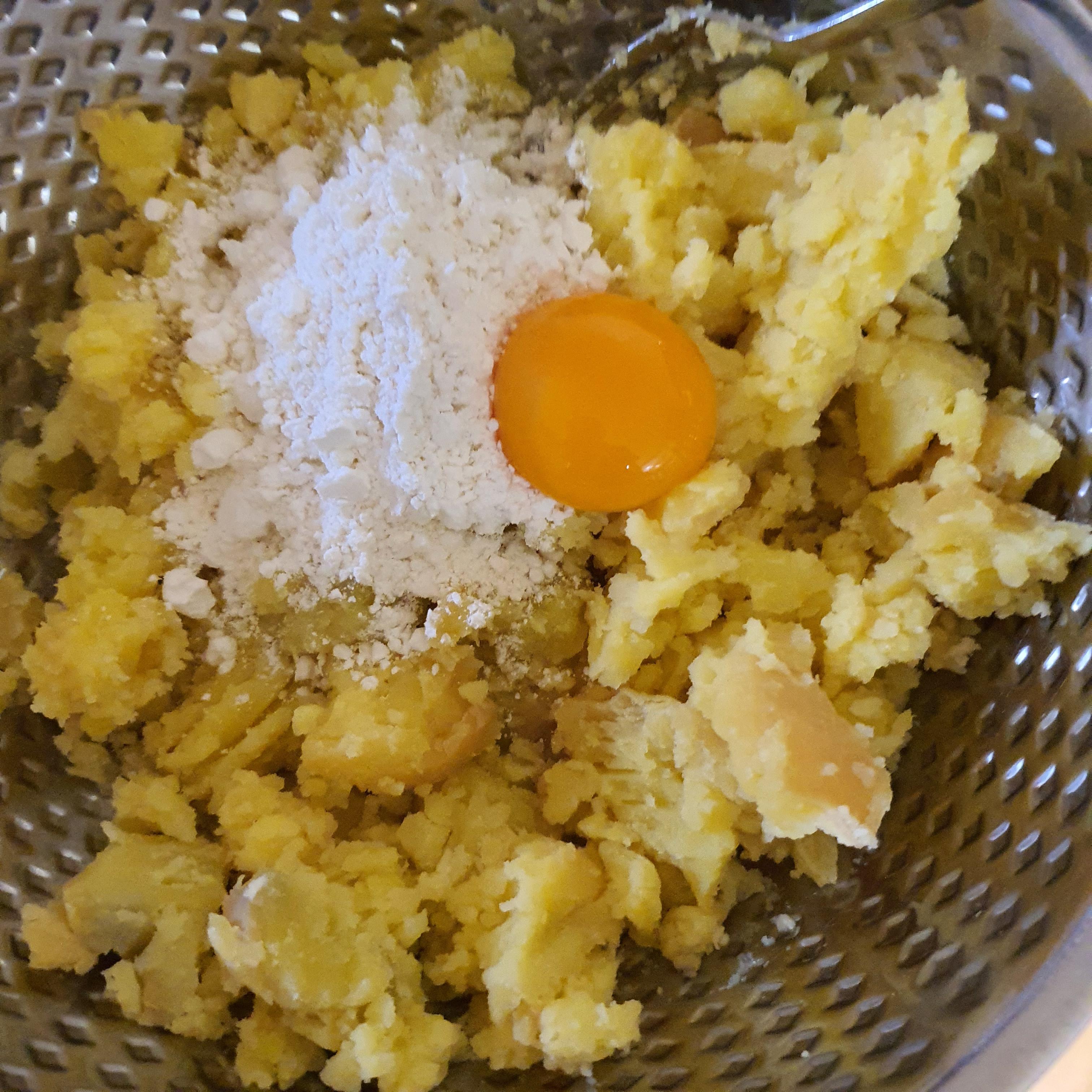 그리고나서 감자를 으깨서 달걀 노른자 1개와 박력분 6스푼 넣어 반죽해줍니다.